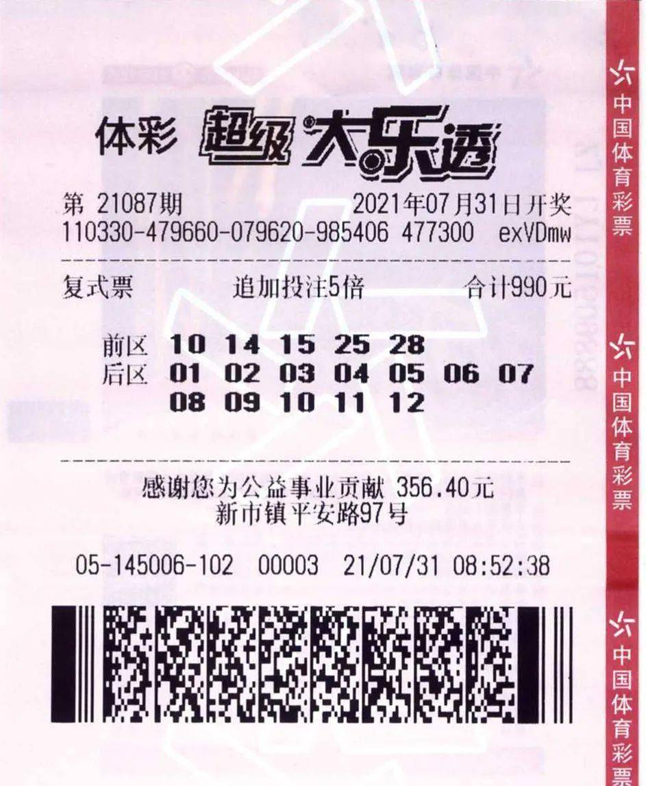 体彩大乐透21087期开,浙江湖州一位彩平易远得到5注的追加投注一等,中的彩票是一张5+12的复式投注,进止5倍的追加投注。