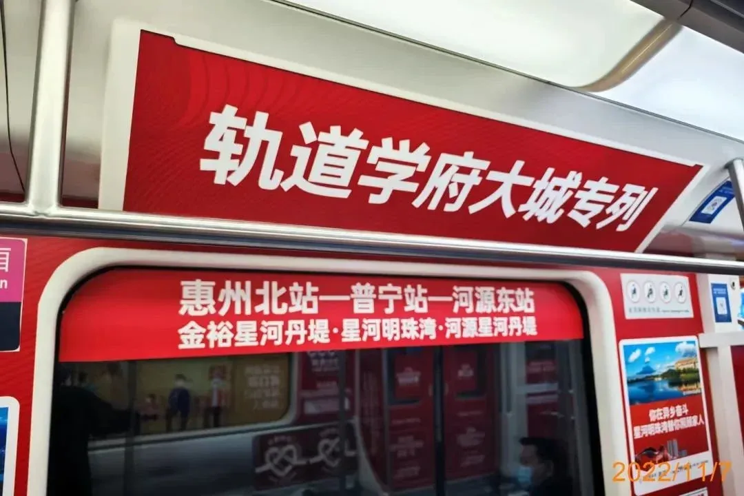 正在地铁4号线的“轨府大盘专列”上,星河拿出来三个标杆之作——惠州金裕星河丹堤、河道星河丹堤、另有普宁星河明珠湾广告布喷绘效果图,个个都称得上是原地最糟的楼盘。