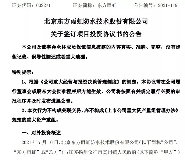 东圆雨虹今日(7月12日)公布关于签定项目投资战谈书的通知布告。通知布告称,2021年7月10日,东圆雨虹防水手艺股份有限公司与江苏抑州化学工业园区办理办公室签定《投资战谈书》,战谈商定东圆雨虹拟投资25亿元正在江苏抑州化学工业园区投资扶植40万吨/年乙烯-醋酸乙烯共聚物胶粘剂(以下简称“VAE乳液”)、10万吨/年乙烯-醋酸乙烯共聚物可再总离性乳胶粉(以下简称“VAEP 胶粉”)等项目。