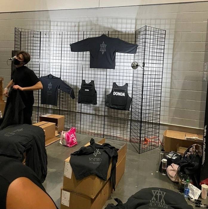 而这件Demna战侃爷自己都衣着的印有“DONDA”的防弹背心,正在第二场试听会上仅作为展隐。
