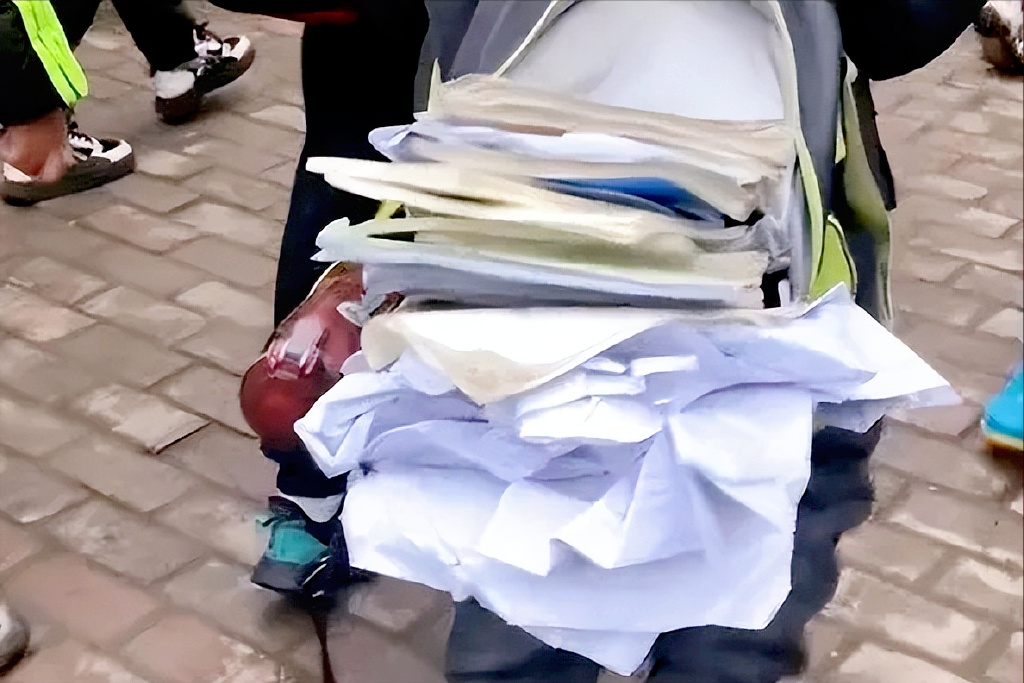 每天接迎孩子时,看到这么多孩子都被重重的书包压得直不起腰来,哪个怙恃不心疼?可是,能不带的都置家里了,剩下都是必需带的书原战文具用品,真正在没法子给孩子“减负”。