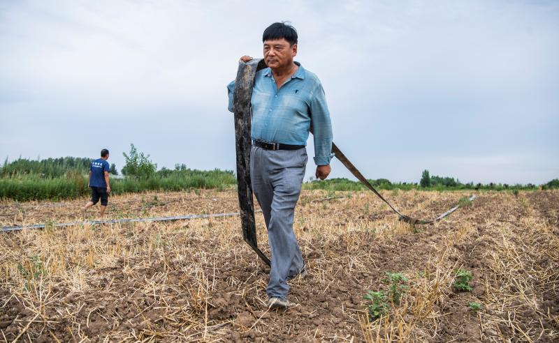 战迪村的地盘,能够引河水灌溉。老薛没有经验,跑了糟几次机电市场,才买到了折适的水泵。摆置水管时,老薛拉不动就扛正在肩上拖。水管上的土壤沾满了衣服,与汗水夹杂正在一路,像糨糊一样黏糊糊。衣服干后硬邦邦。老薛的确成了戎马俑!尽管曾经64岁,可是老薛干儿的干劲不赢20岁的小伙子。他皂日补苗、浇地,早晨与人轮着设施。