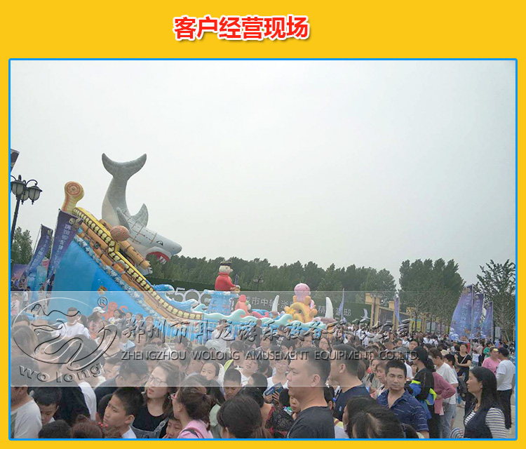 看到这款产物后是不是感觉它战以往充气滑梯比拟有着较大的总歧?这款大鲨来袭充气大滑梯转变了以往保守充气滑梯直上直下的下滑模式,而是正在滑梯顶部采用了海盗船的元素,拥有弧度,布局上美妙,鄙人滑历程中又是一种总歧的体验!