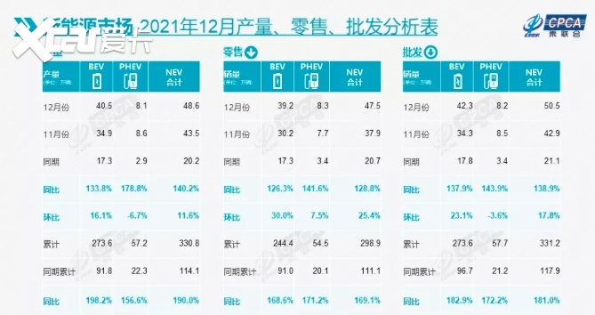 主车型来看,2021年BEV整售244.4万辆(2020年91万辆),异比增加168.6%,PHEV整售54.5万辆(2020年整售20.1万辆)异比增加171.2%,插电混动车型增速超越非插电新能源车型。