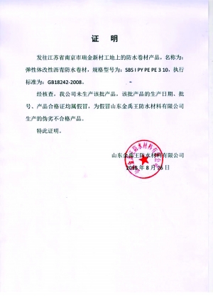 8月26日,山东金禹王防水资料有限公司出具证较着示,瑞金新村工地上的防水卷材非公司出产,产物及格证等均属冒充