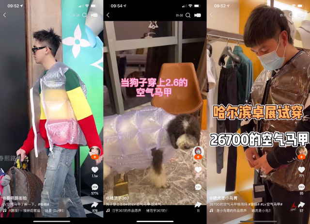 因为正在中国时装秀的出名度很高,加上背心根基上都是刻有LV出名老花元素的充气PVC,因而正在各种社交平台上衍生出数百个DIY视频,网友穿上用袋装芯片造成的背心,或是用手绘老花字样的充气包装资料。