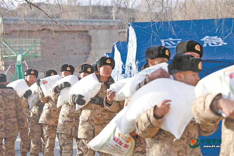 12月20日,青海总队灵第一支队官卒正在平易远战县中川乡草滩村安置点为受灾群众供给热食保障。罗元凯摄