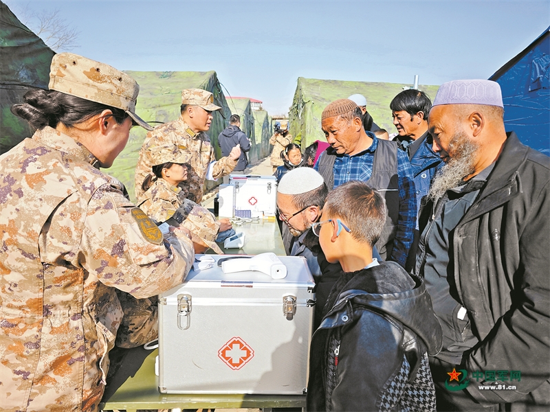 12月21日,第940病院医疗队赴积石山县刘集乡安置点,为受灾群众开展医疗巡诊等办事。郭泽天摄