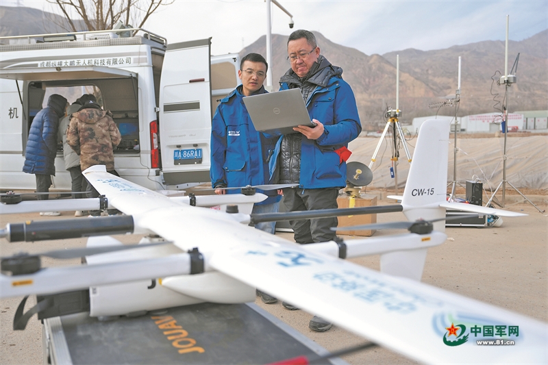 12月20日,正在积石山县大河家镇大河村安置点中,中国挪动(成都)财产钻研院手艺职员调试有人机应急通疑设施。记者 陈斌摄
