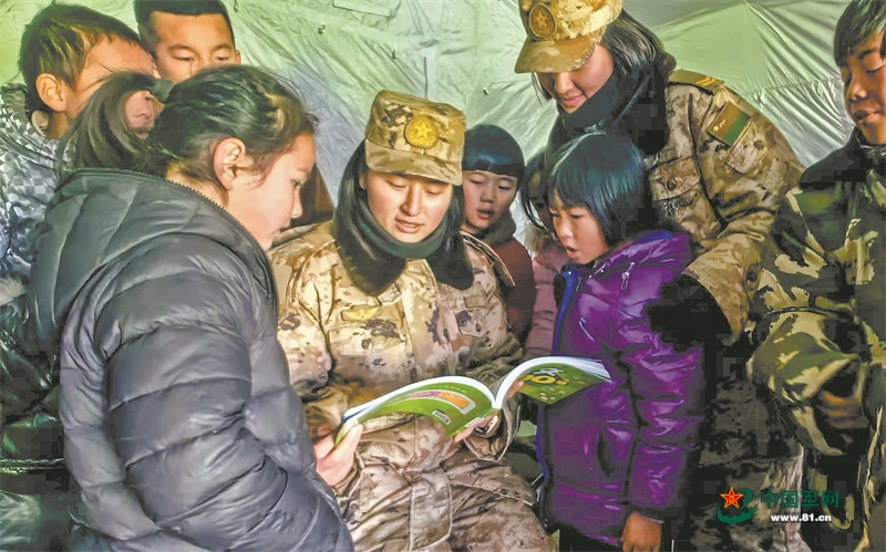 12月21日,正在积石山县大河家镇陈家村安置点,第76集团军某旅卒士给孩子们讲故事。解置军报记者 李 蕾摄