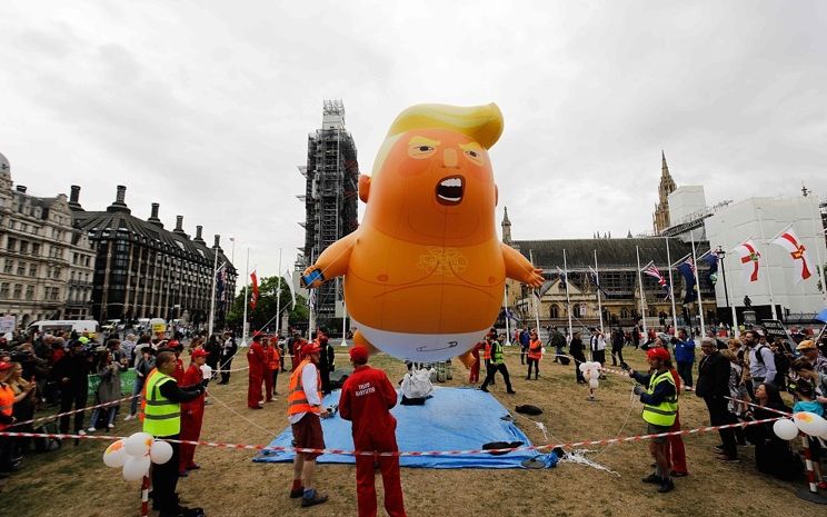 2018年7月,英国众筹造作了一个衣着尿布的特朗普充气娃娃(Trump Baby),使其正在特朗普对英国进止事情拜候时期主天而降、飞越议会大厦。今后,这个充气娃娃成了全世界正特朗普勾应的意味。
