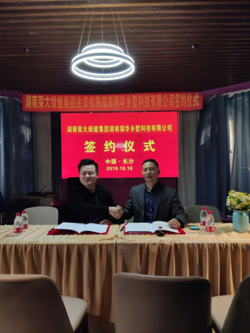 2019年10月16日上午湖南荣大绿健科技有限公司与湖南瑞华乡墅科技有限公司正在湖南幼沙德思勤都会广场都会集会核心签订战谈。由湖南荣大绿健集团全资支购湖南瑞华乡墅科技有限公司。