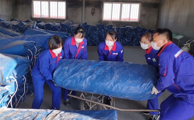 2月11日,三辆满载篷布的半挂车连续达到公司篷布库。这是疫情以来支到青岛装车站交回的第一批篷布。三车共有252块篷布,每块60多公斤,这个总质对付4名子班员来说不算轻,以至要凌驾她们的体重。