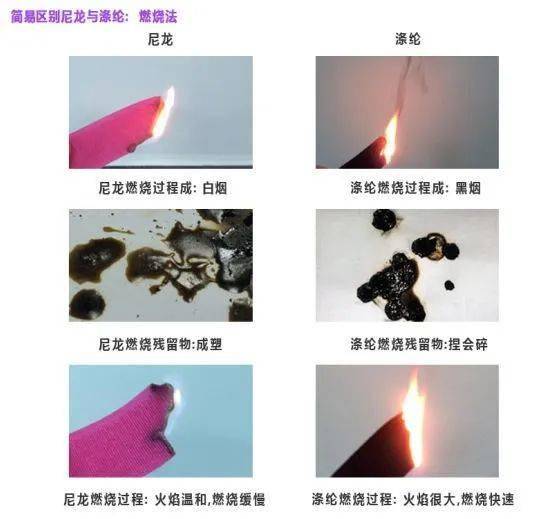 涤纶;接远火焰--硬化,熔融卷胀,正在火焰中--熔融,早缓燃烧,有火焰,焰边呈蓝色,焰顶冒黑烟,总开火焰--继续燃烧,有时停止燃烧而自着。燃烧气息--略带芳喷鼻味或甜味。残留物特性--灰烬呈硬而黑的圆球状,用手指不易压碎。