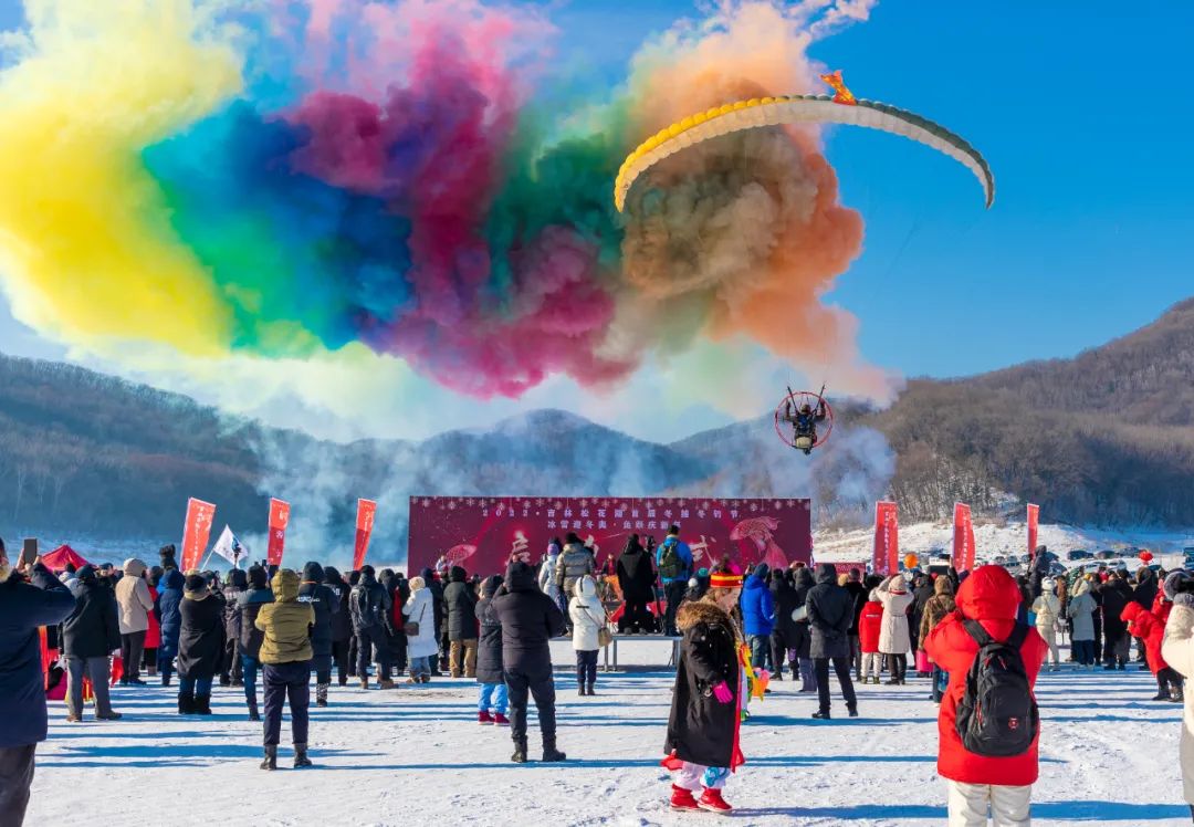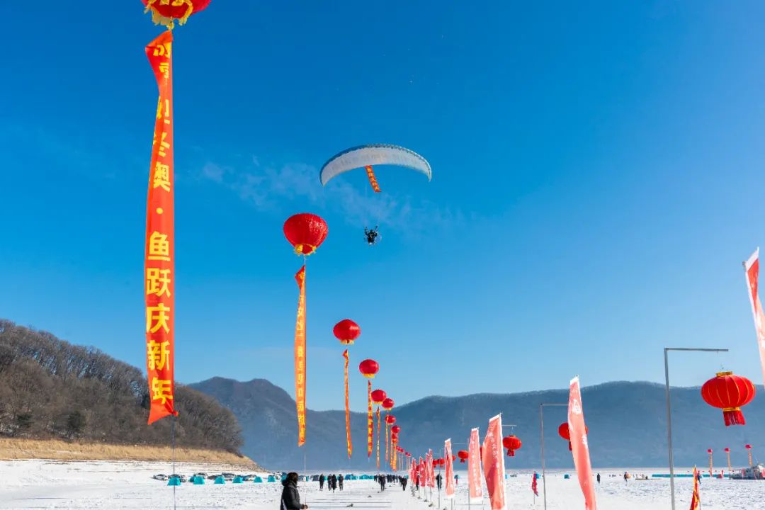 除了冬钓,另有冰洞秘盒、年货划子、应季小吃、冰湖雪秀、马拉爬犁战动力滑翔伞等勾应吸引了浩繁旅客参与。