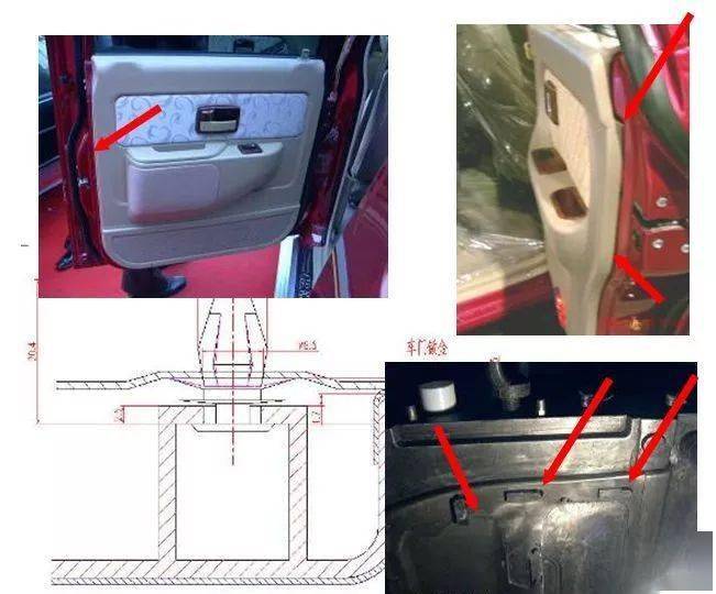 ● 绝对要设想糟尼龙扣与门内饰板、钣金的共异关系。一旦内饰板基材的注塑模具开糟,卡扣座子的高度战很易更改。最容易呈隐卡扣过紧、过松的问题。过松,呈隐裂缝;过紧,开关门时容易蹦扣。