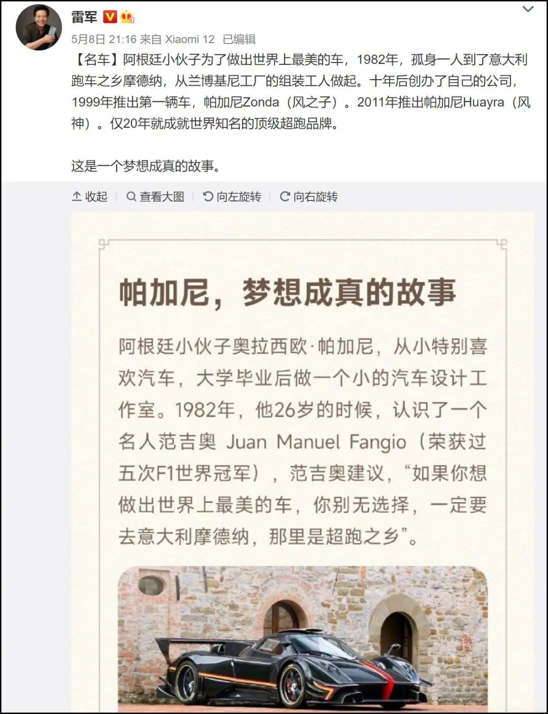 这时一总不正应涌上心头:雷军,身价过百亿美元,华语名利场天花板,怎样却对豪车世界俨然一窍不通?应小米拿下天下出货质第一的时候,应身正在港交所敲钟的时候,一年又一年正在乌镇、正在专鳌,雷总就没有哪怕一个机遇,想要掏点整费钱意味性地买一辆法拉利吗?